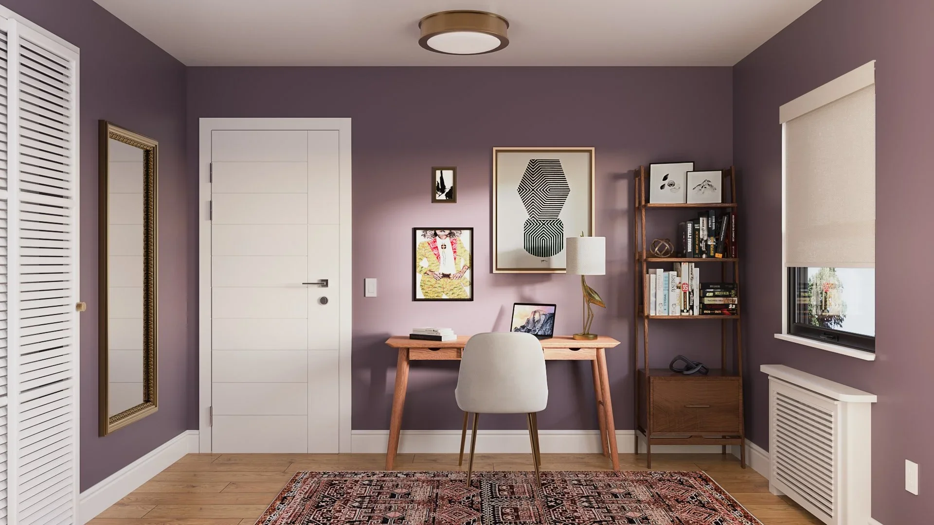 Photorealistic 3D rendering of a Modern Boho style home office designed by virtual interior designer Joshua Jones of JJones Design Co.