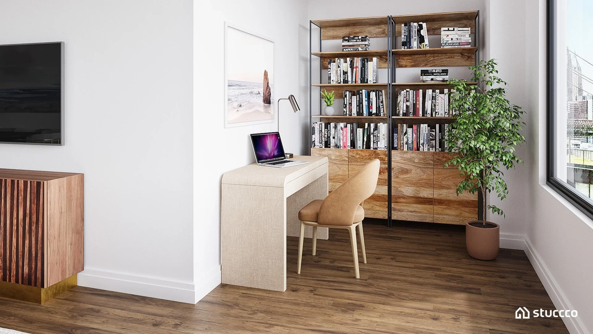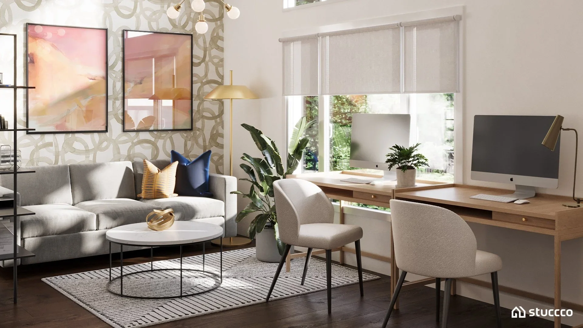 Photorealistic 3D rendering of a modern organic home office set in an alcove of the living room. Featuring blackout shade for an ideal video call backdrop, designed by virtual interior designer Joshua Jones of JJones Design Co., with 3D rendering by Stuccco.