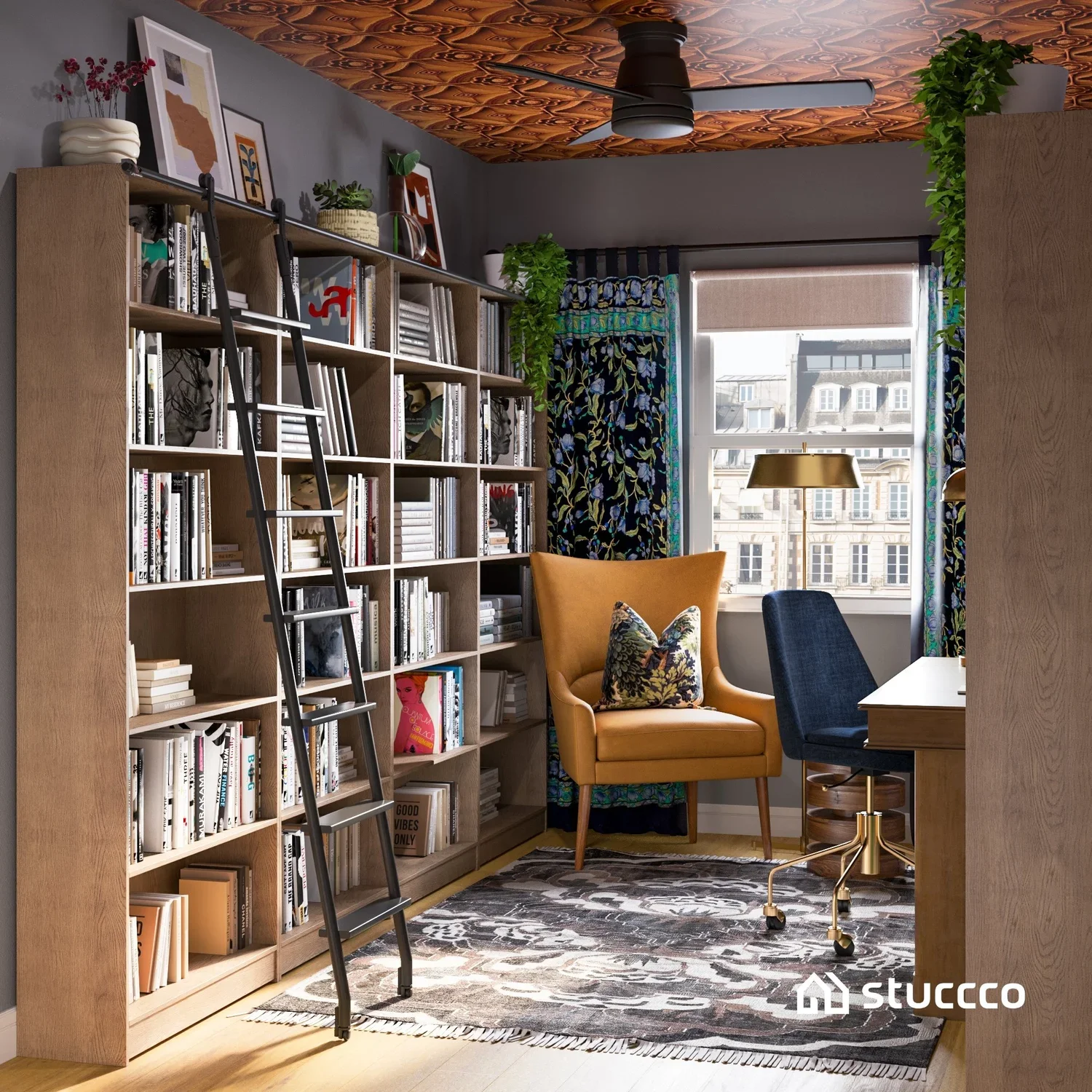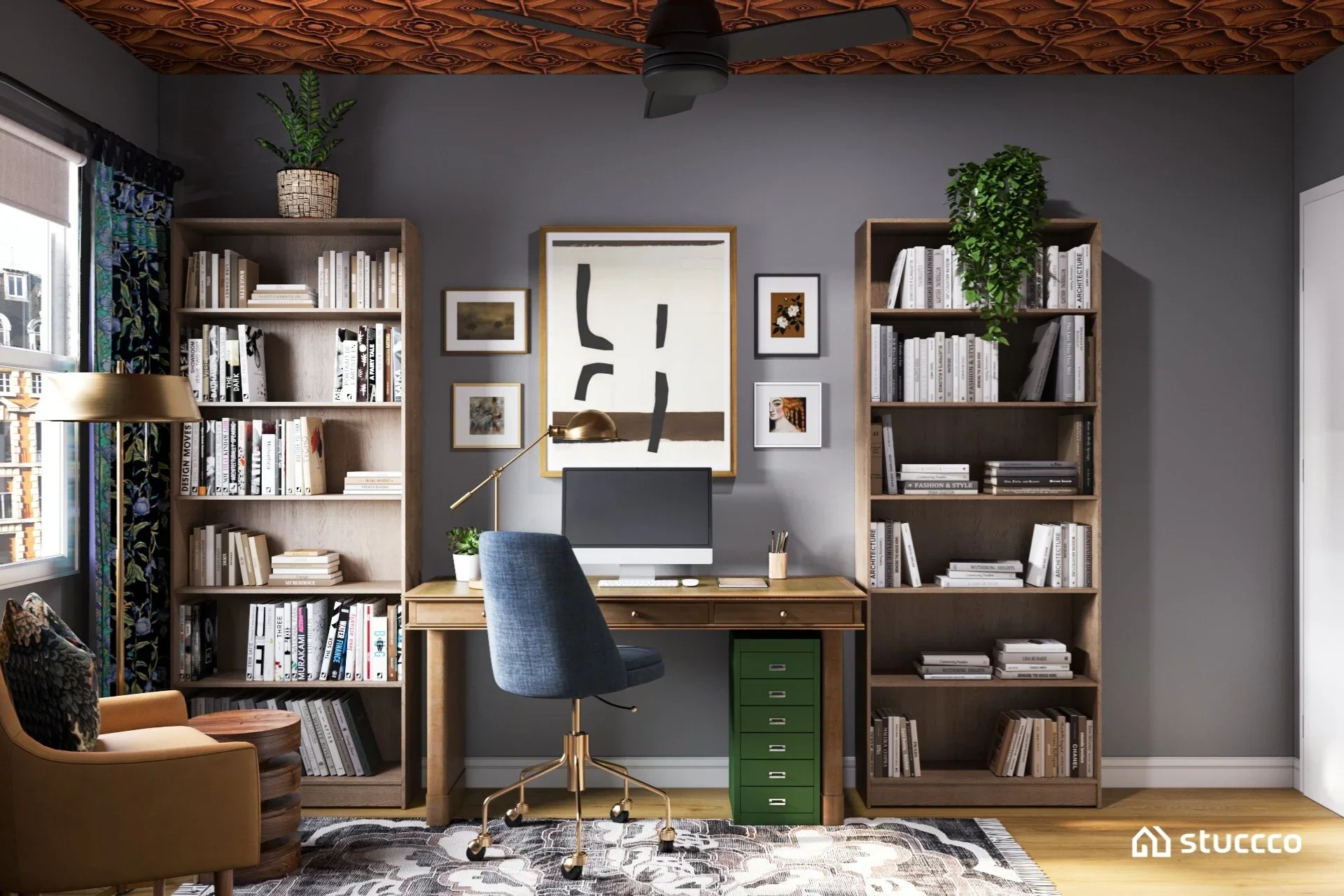 Photorealistic 3D rendering of a bold and eclectic home office designed by virtual interior designer Joshua Jones of JJones Design Co., with 3D rendering by Stuccco.